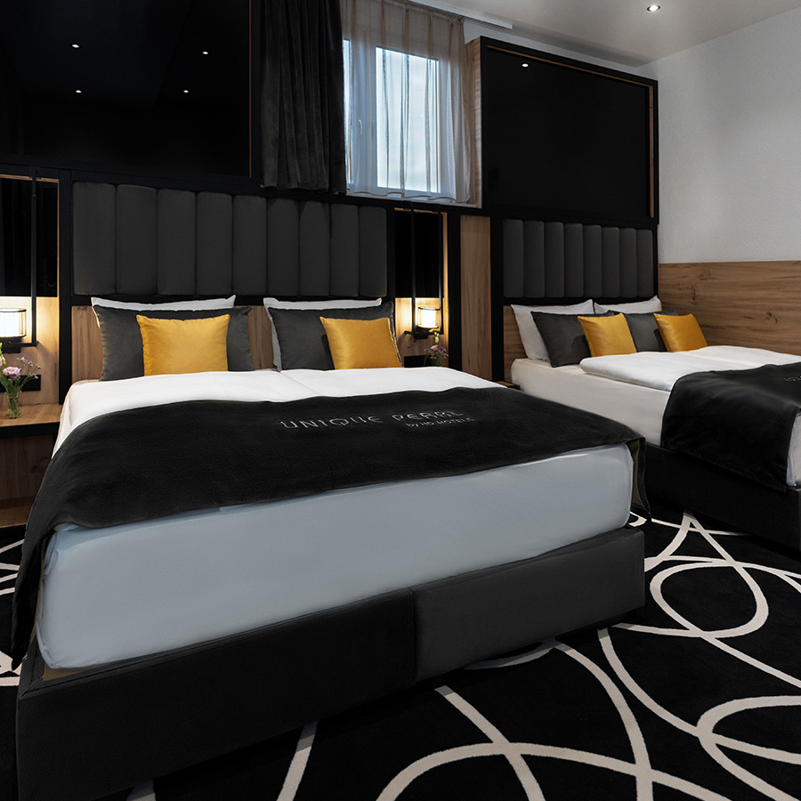 Sie verfügen über 2 Doppelbetten King-Size und einer Schlafcouch, einen Arbeitsplatz Dusche/Bad/WC, Schreibtisch, Flachbildfernseher, Telefon, kostenfreies W-LAN, kostenfreier Safe, Teezubereitungsset, Haartrockner sowie Handtuchwärmer. Ausschließlich Nichtraucher.